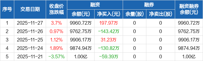 恩威医药:融资净买入197.97万元,融资余额9960.72万元(11-27)