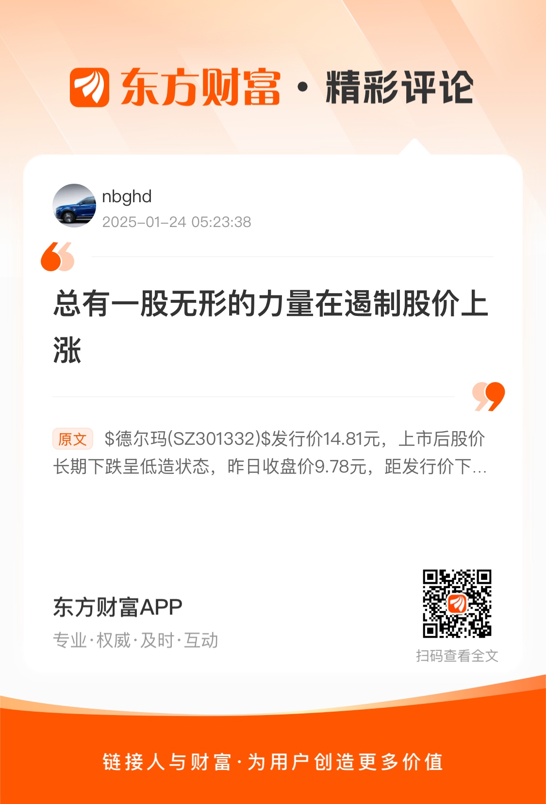 $德尔玛(SZ301332)$ 发行价14.81元,上市后股价长期下跌呈低造状态,昨日收盘价9.78元,距发行价下跌34%。老妈子都看不下去了。