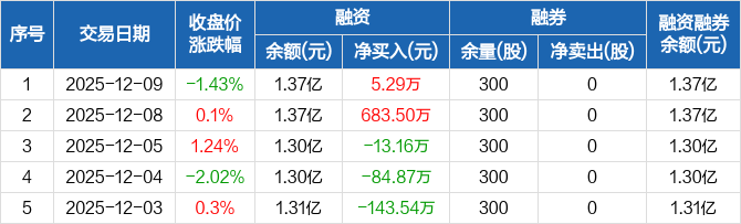 德尔玛:融资净买入5.29万元,融资余额1.37亿元(12-09)