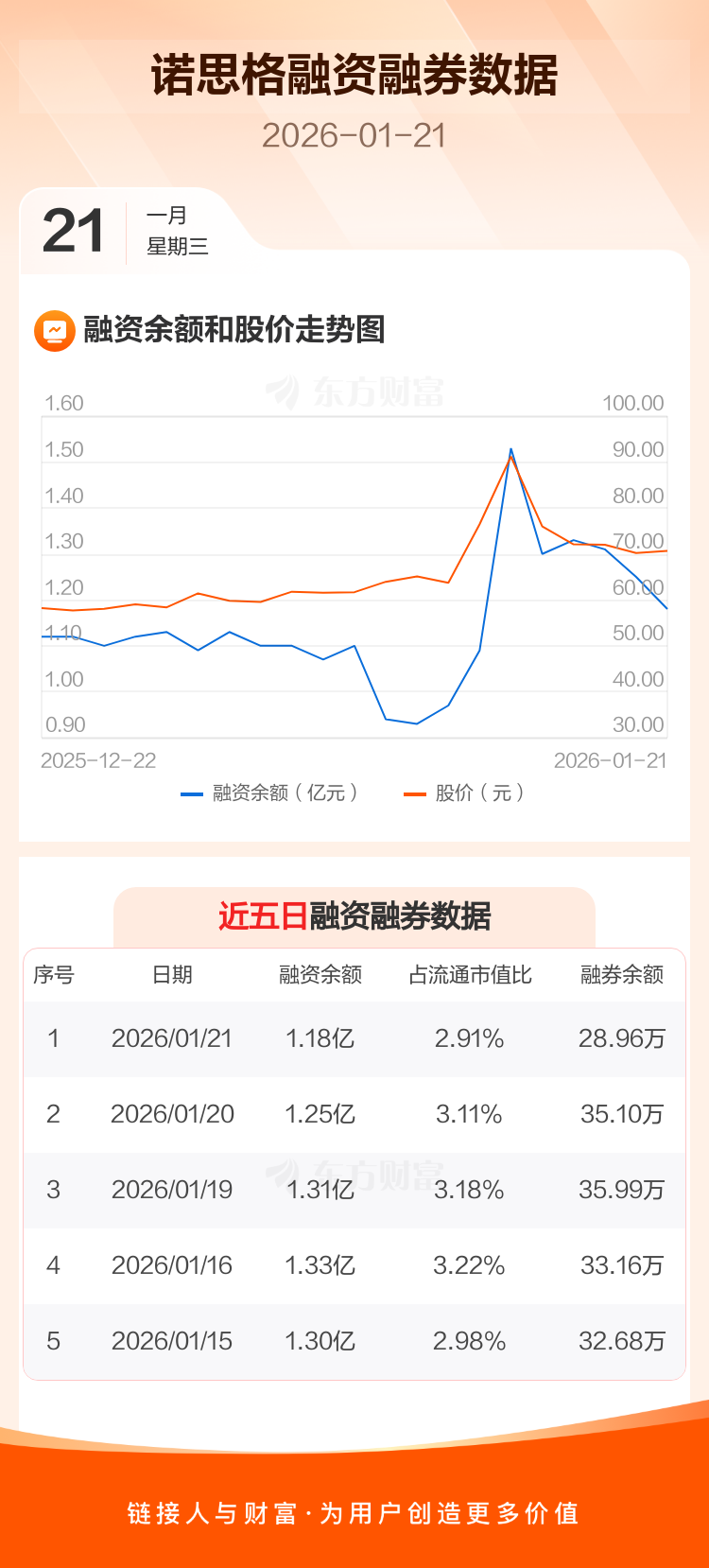 交易所最新数据显示,诺思格于2026年1月21日获融资买入1386.34万元,融资偿还2121.60万元,当日融资净偿还735.26万元。目前,该股融资余额1.18亿,占流通市值比例为2.91%。