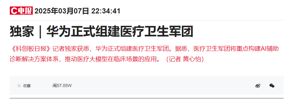 《科创板日报》记者独家获悉,华为正式组建医疗卫生军团。据悉,医疗卫生军团将重点构建AI辅助诊断解决方案体系,推动医疗大模型在临床场景的应用。(记者 黄心怡)