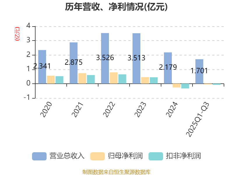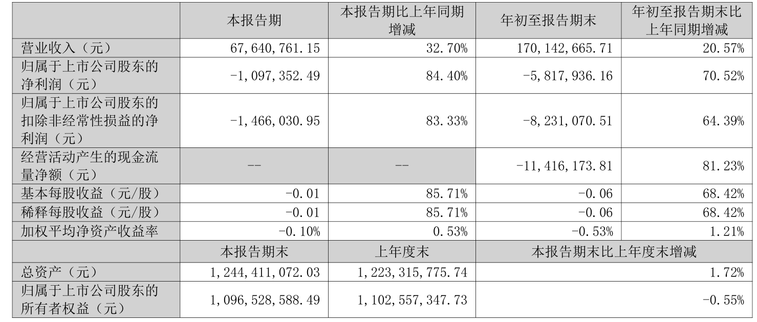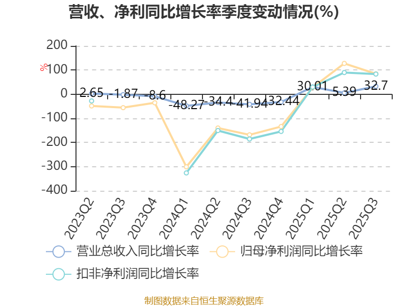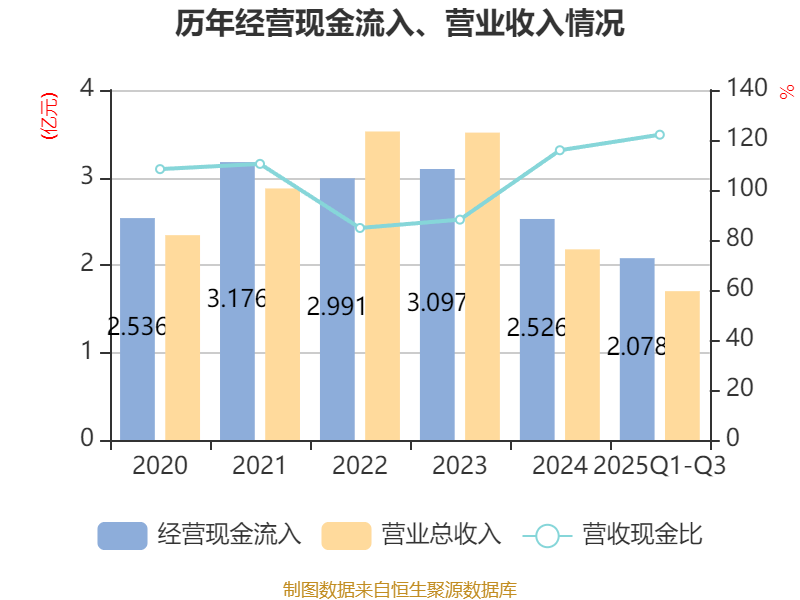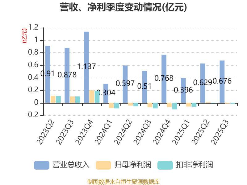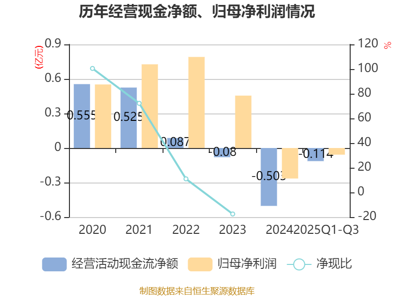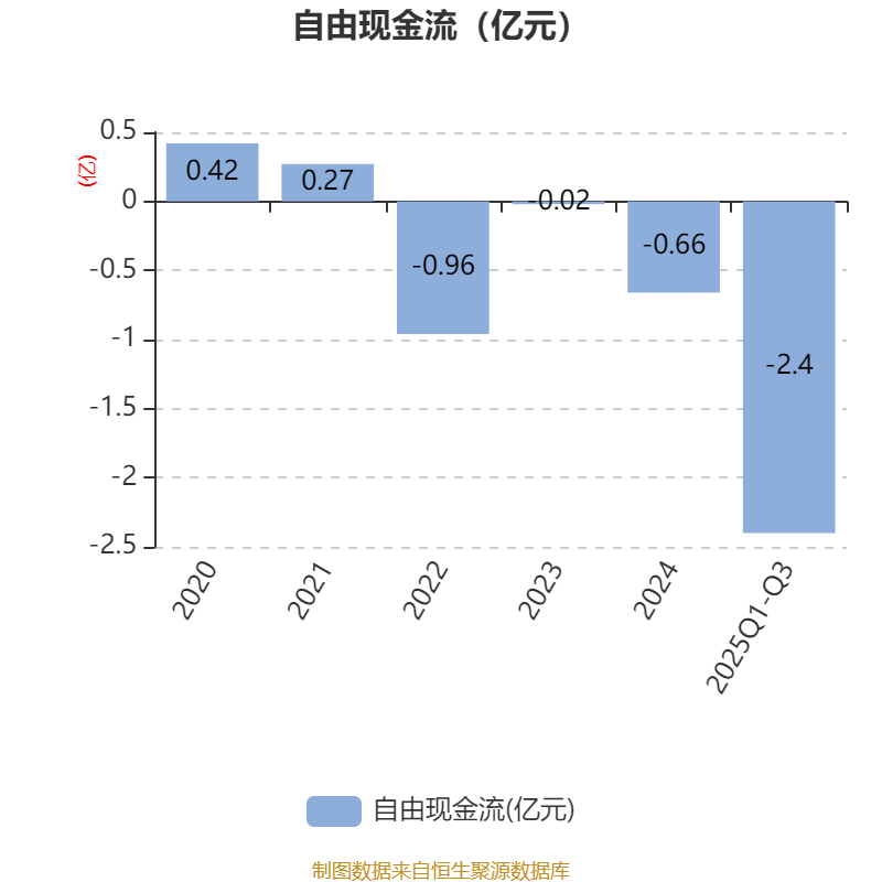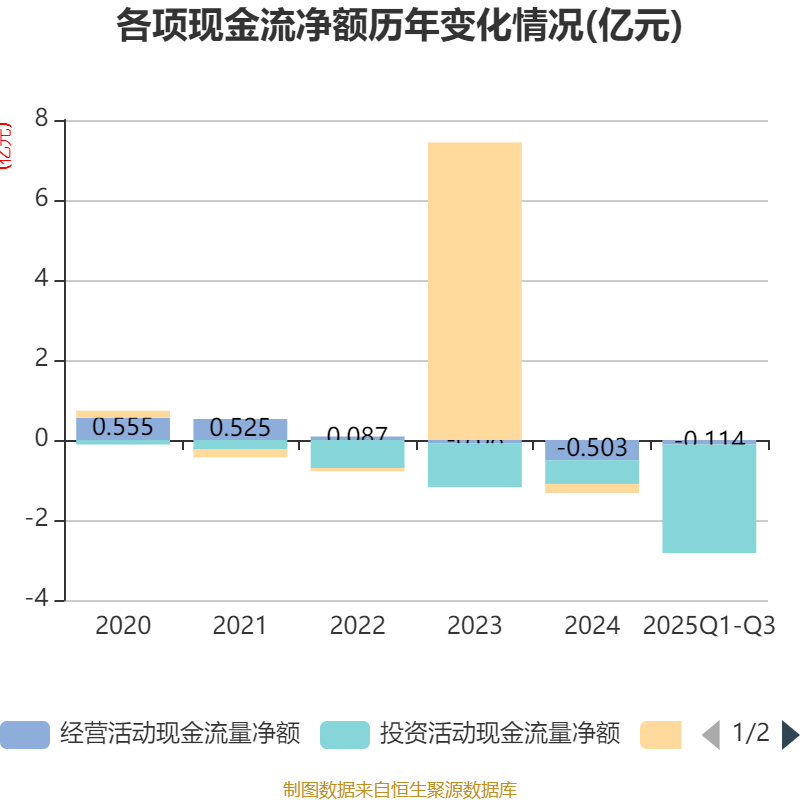 2025年前三季度,公司经营活动现金流净额为-1141.62万元,同比增加4939.28万元;筹资活动现金流净额33.6万元,同比增加1516.03万元;投资活动现金流净额-2.71亿元,上年同期为-3.02亿元。