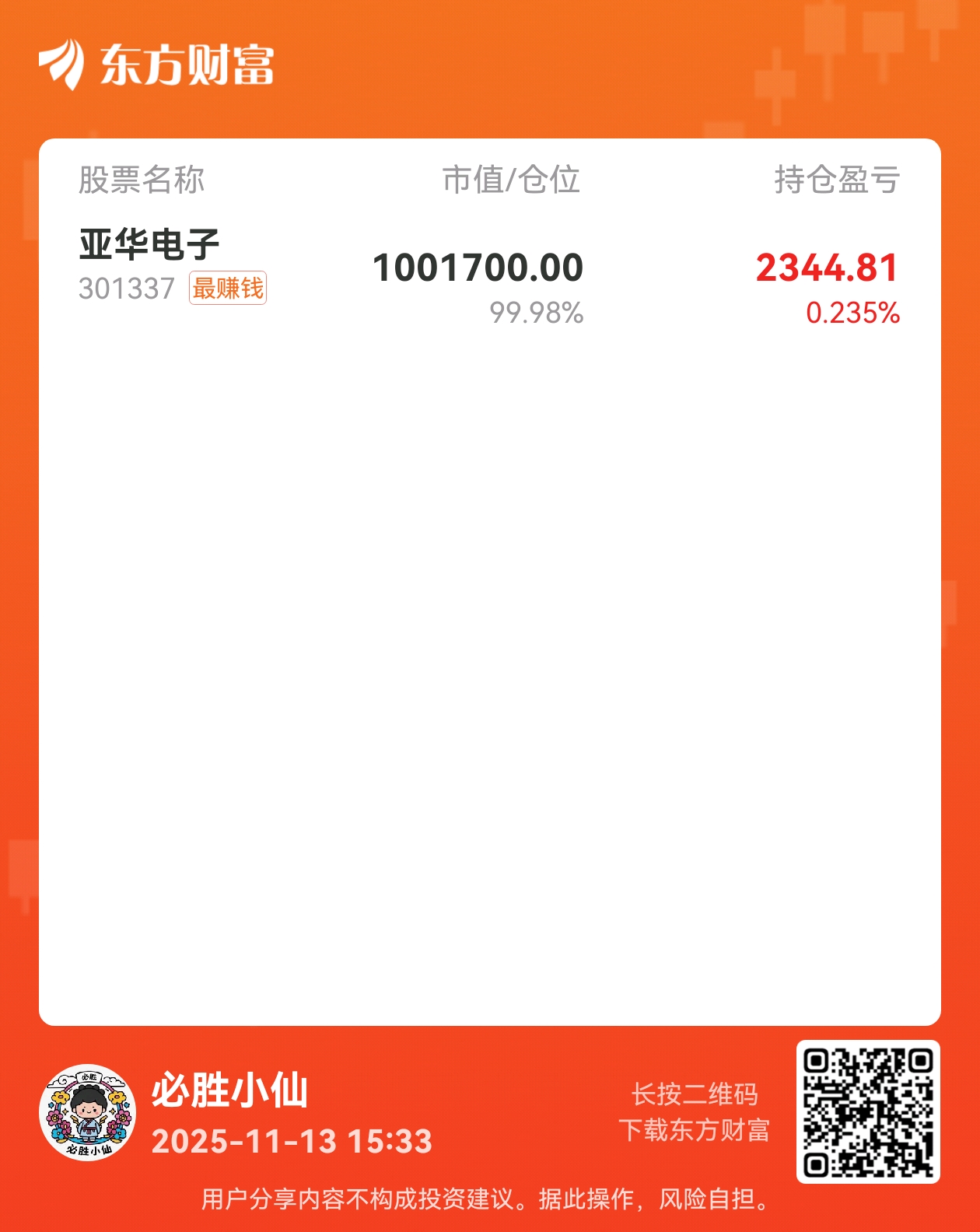 $亚华电子(SZ301337)$ $ST股(BK0511)$ $创业板指(SZ399006)$ 亲,小仙今天想明白一件事,一年花30W,如果有1000W,一辈子也花不完。毕竟小仙一年炒股收益超过10%,所以,等等吧,不贪心就是很好的,很好的,很好的。