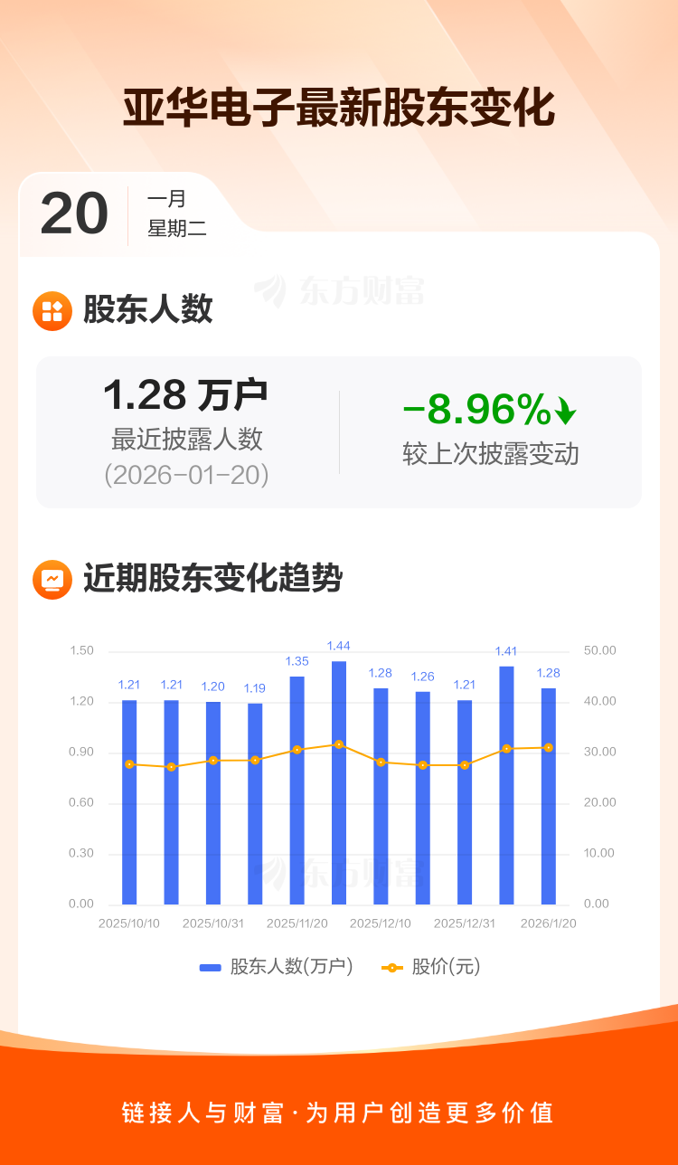亚华电子:截至1月20日最新股东户数1.28万户,较上期减少8.96%