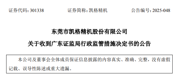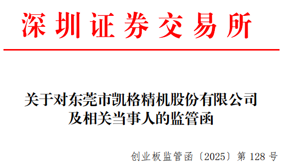凯格精机 (301338)迎来监管"组合拳"。10月23日,该公司接连收到深交所下发的《关于对东莞市凯格精机股份有限公司及相关当事人的监管函》和广东证监局下发的《关于对东莞市凯格精机股份有限公司采取责令改正并对邱国良、刘小宁、宋开屏、邱靖琳采取出具警示函措施的决定》(以下简称《决定书》),直指公司存在募投项目资金违规使用问题。