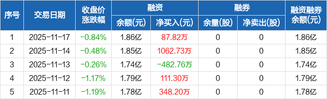 融资方面,当日融资买入1102.65万元,融资偿还1014.83万元,融资净买入87.82万元。融券方面,融券卖出0股,融券偿还0股,融券余量0股,融券余额0元。融资融券余额合计1.86亿元。