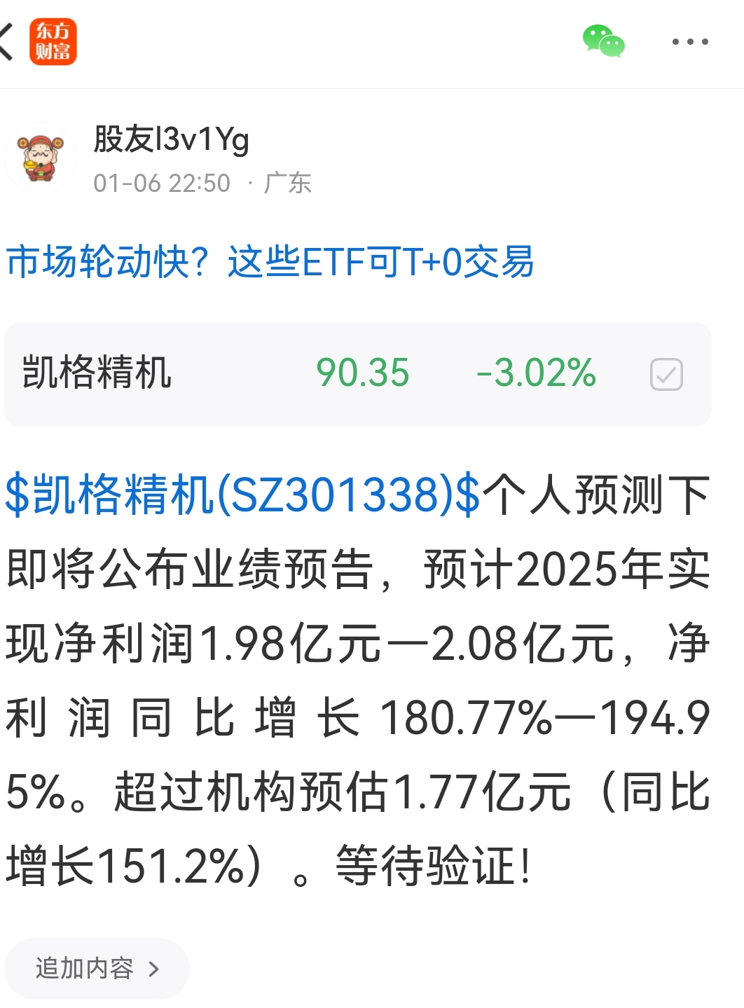 $大族数控(SZ301200)$ $凯格精机(SZ301338)$ 大兄弟大族数控业绩预告出来了,打个样了,我预测下凯格精机即将公布业绩预告,预计2025年实现净利润1.98亿元—2.08亿元,净利润同比增长180.77%—194.95%。超过机构预估1.77亿元(同比增长151.2%),等待验证!