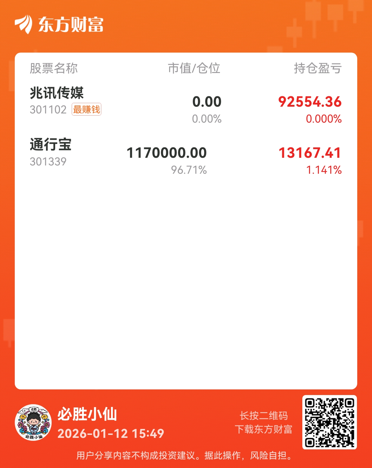 $通行宝(SZ301339)$ $创业板指(SZ399006)$ $ST股(BK0511)$ 亲,今天是值得纪念的日子,4年半的努力,收益破500%,明天提现,本金归零。想当初小仙这个账户是学打板,之后当月就亏30个点,之后还是回归st策略,之后几年又开始加入微盘股。低吸波段为主,模式吃上风的时候赚钱,下风的时候放回撤。满仓操作复利是朋友,回撤就是敌人。这些年一直在践行师父说的八个字,克服恐惧,克制贪婪。炒股保持良好的心态,永远是首要的。小仙要开始终结这个游戏了,提现就是开始……要把股市当提款机而非充值机哦,希望喜欢和讨厌小仙的人,都一路长红,很好的,很好的,很好的。