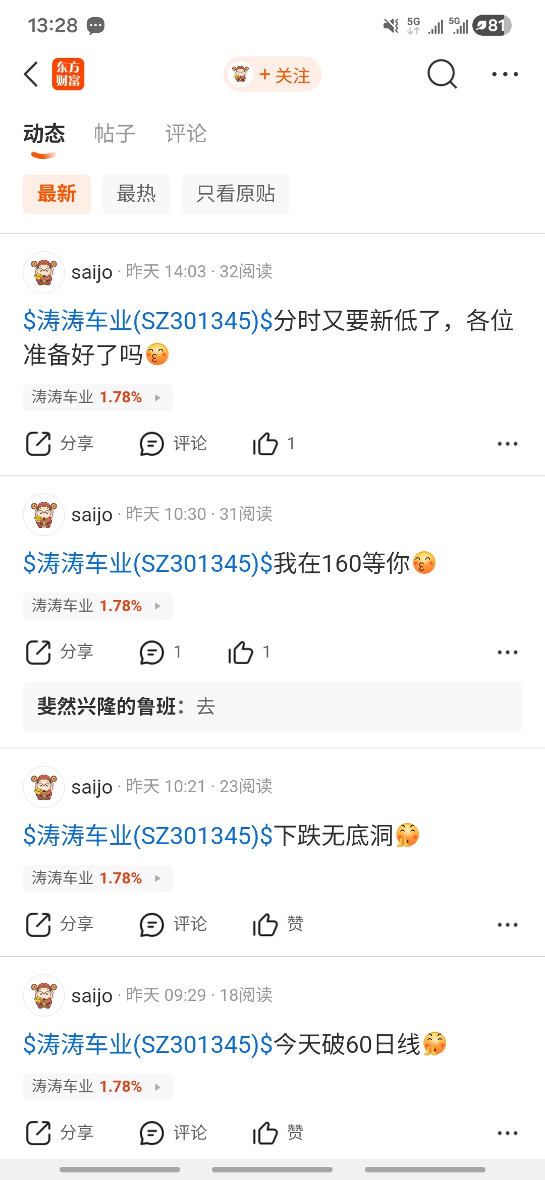 截图下这个saijo的的帖子,等过几天新高,看看会不会删帖。跳梁小丑,还160呢