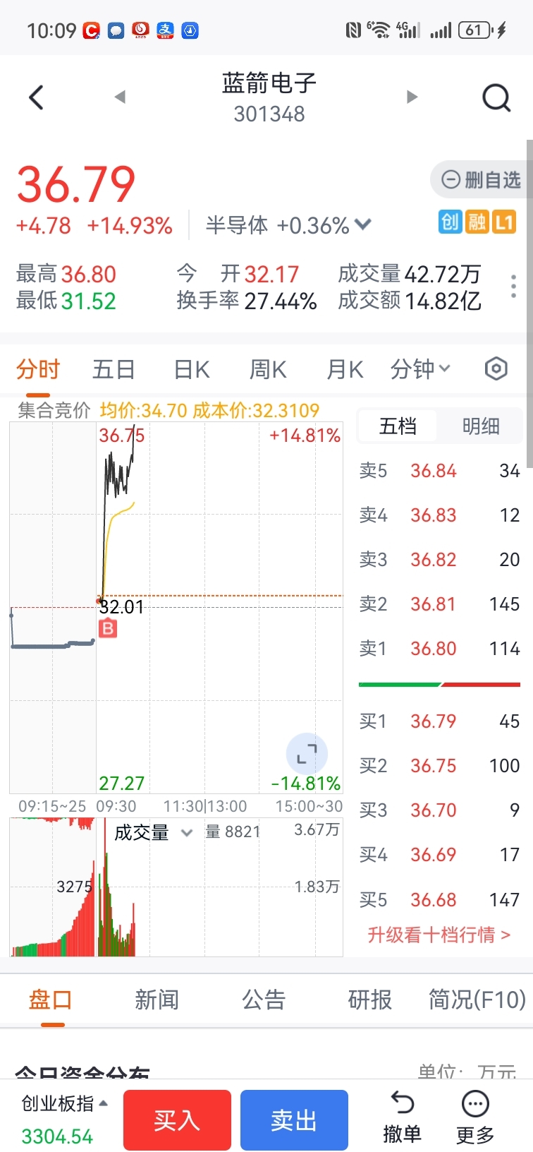 $蓝箭电子(SZ301348)$ 昨天被洗了筹码,看龙虎榜被机构捡便宜筹码了,竞价再介入,可惜仓位上少了,哎