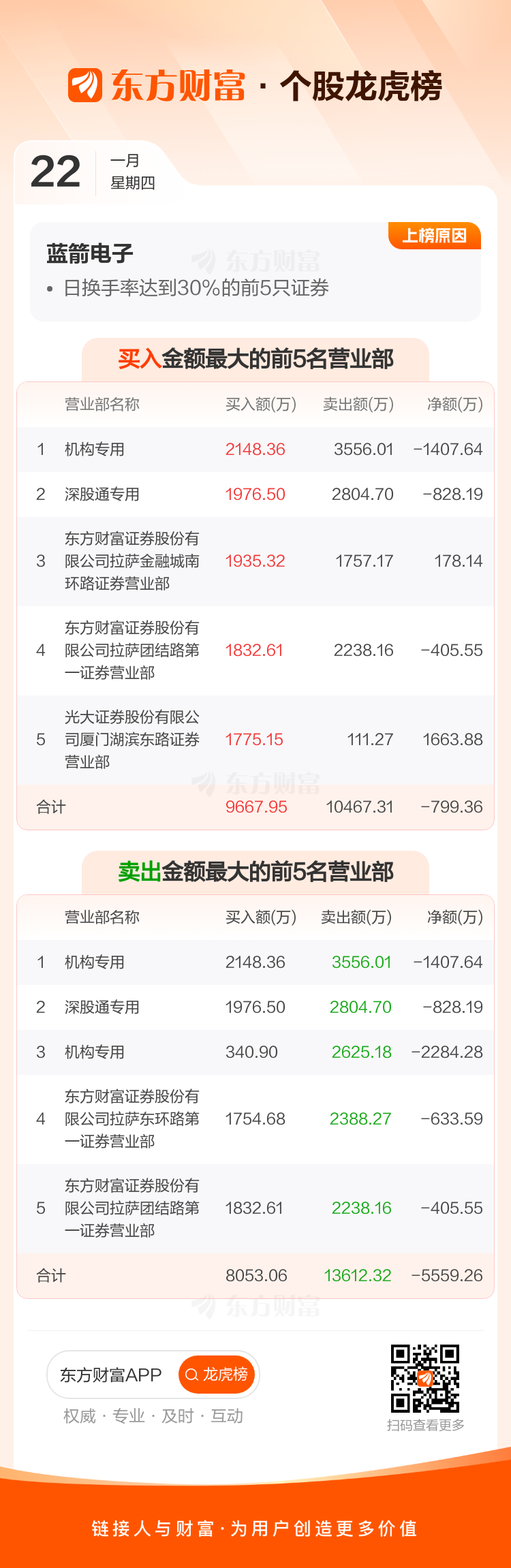 蓝箭电子(301348)龙虎榜数据(01-22)