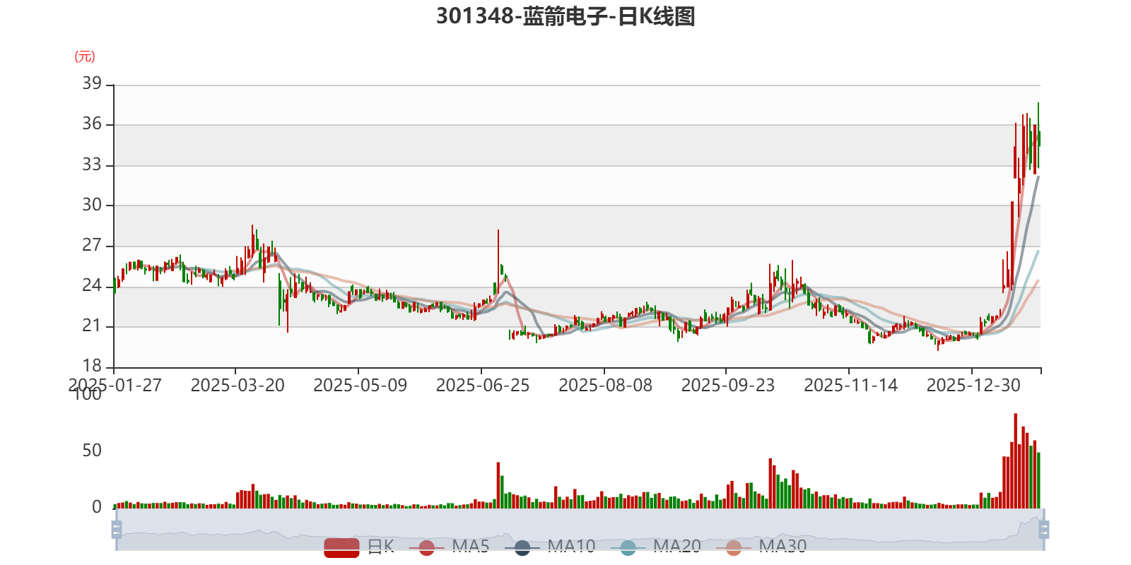 中证智能财讯蓝箭电子(301348)1月26日晚间披露2025年度业绩预告,预计2025年归母净利润亏损3000万元至4000万元,上年同期盈利1511.18万元;扣非净利润亏损3300万元至4300万元,上年同期盈利1089.23万元。以最新收盘价计算,市净率(LF)约5.56倍,市销率(TTM)约11.4倍。