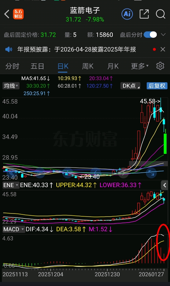 MACD马上死叉,调整到30日线24.9、击进的可以轻仓买入,毕竟上面套了一大堆追高者,短期是没有资金给解套了,大资金都去炒黄金了,压力山大的蓝箭套盘稀释完成,新年后才有机会