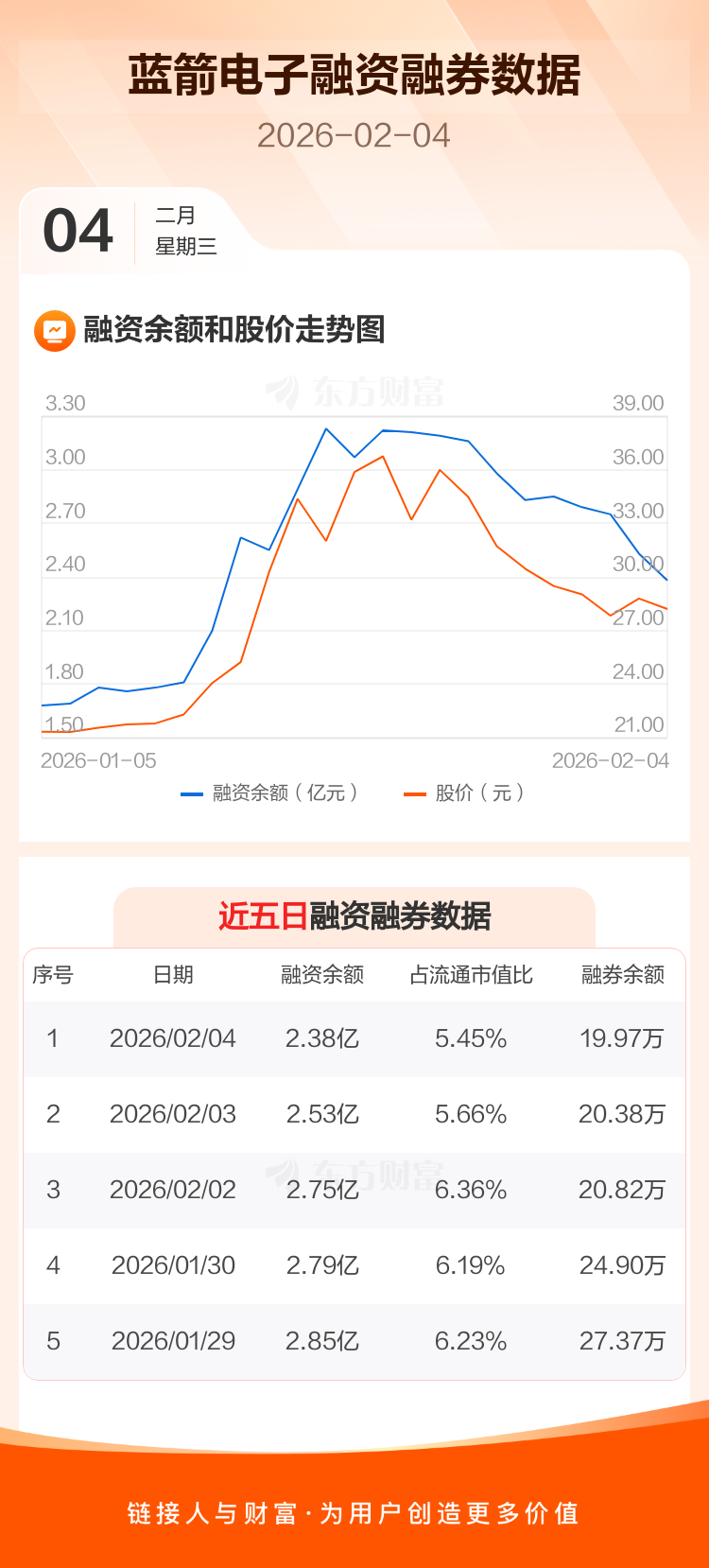 交易所最新数据显示,蓝箭电子于2026年2月4日获融资买入4361.22万元,融资偿还5813.69万元,当日融资净偿还1452.46万元。目前,该股融资余额2.38亿,占流通市值比例为5.45%。