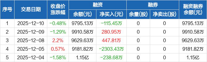 信德新材:融资净偿还115.45万元,融资余额9795.13万元(12-10)