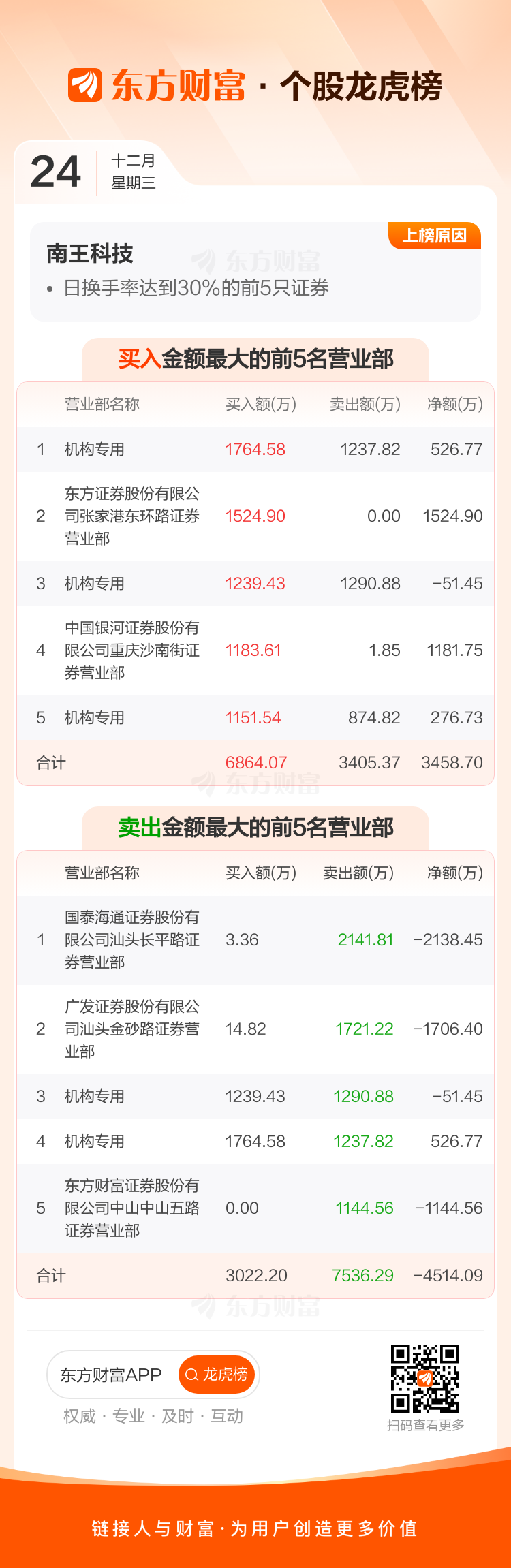 交易所2025年12月24日公布的交易公开信息显示,南王科技因成为日换手率达到30%的前5只证券上榜。南王科技当日收报15.88元,涨跌幅9.90%,偏离值51.08%,换手率51.12%,成交额8.05亿。