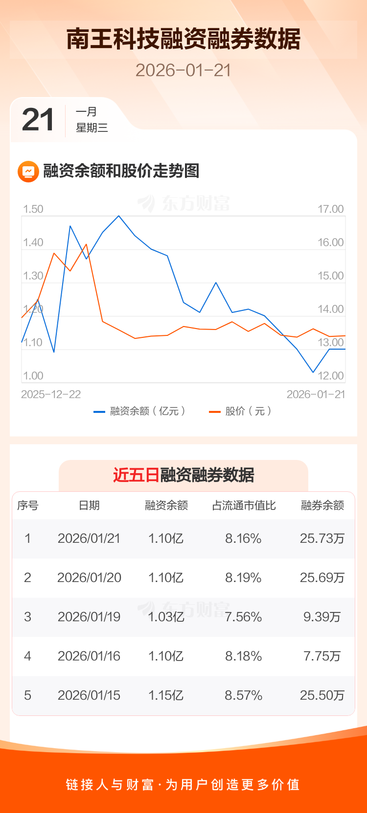 交易所最新数据显示,南王科技于2026年1月21日获融资买入455.86万元,融资偿还485.60万元,当日融资净偿还29.73万元。目前,该股融资余额1.10亿,占流通市值比例为8.16%。