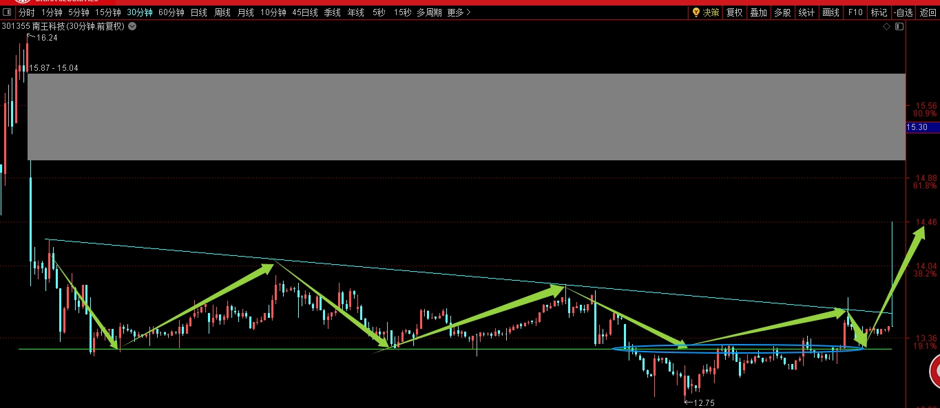 $南王科技(SZ301355)$ 山顶买的不突破上颈线咱也不敢补,下面有个破底结构应该快要动了?