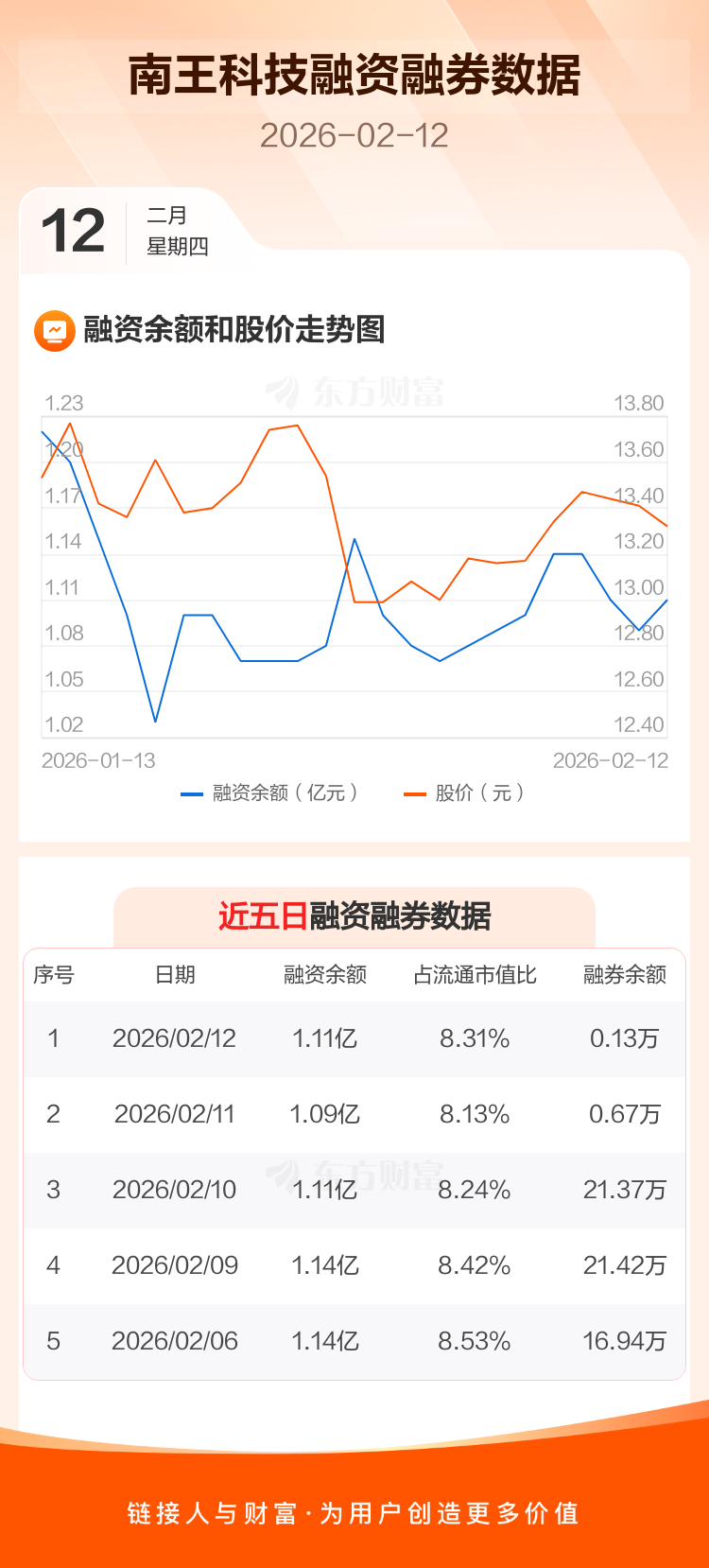 交易所最新数据显示,南王科技于2026年2月12日获融资买入655.37万元,融资偿还478.86万元,当日融资净买入176.51万元。目前,该股融资余额1.11亿,占流通市值比例为8.31%。