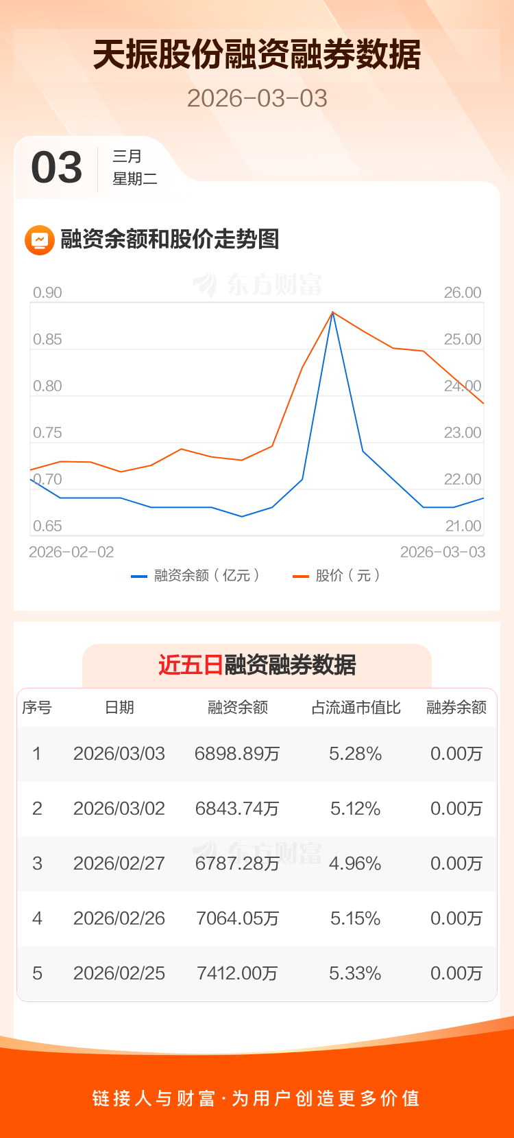 交易所最新数据显示,天振股份于2026年3月3日获融资买入736.64万元,融资偿还681.49万元,当日融资净买入55.15万元。目前,该股融资余额6898.89万,占流通市值比例为5.28%。