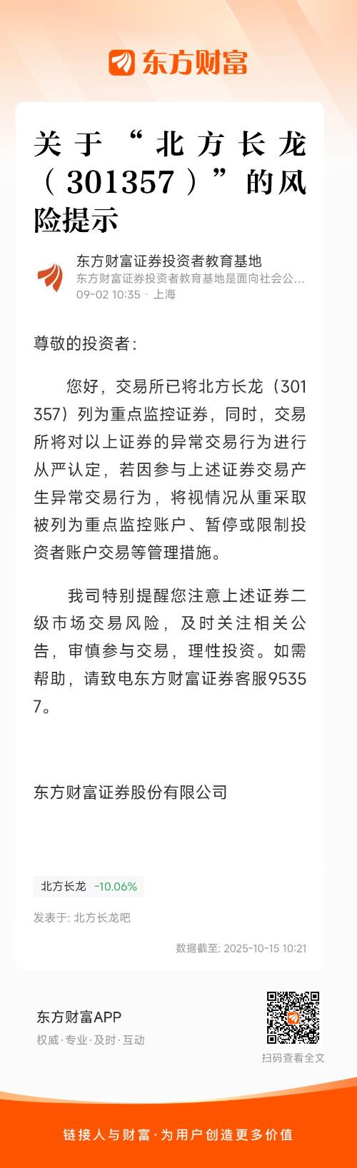 您好,交易所已将北方长龙(301357)列为重点监控证券,同时,交易所将对以上证券的异常交易行为进行从严认定,若因参与上述证券交易产生异常交易行为,将视情况从重采取被列为重点监控账户、暂停或限制投资者账户交易等管理措施。