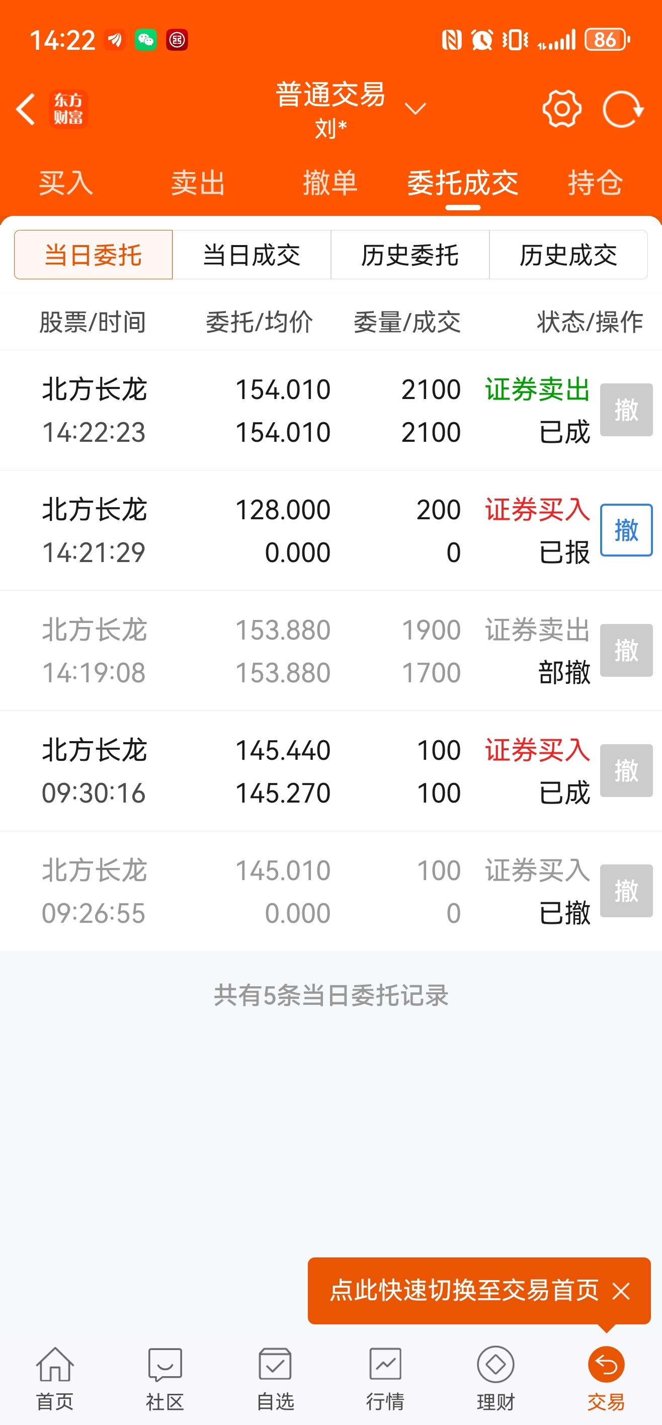$北方长龙(SZ301357)$ 持股53天,留了100股,不买了。受不了。少挣了点,溜了。