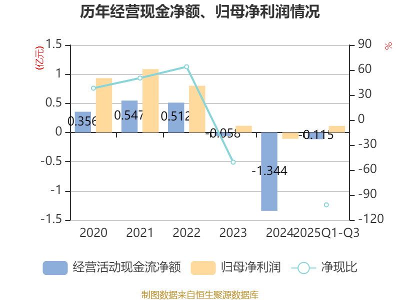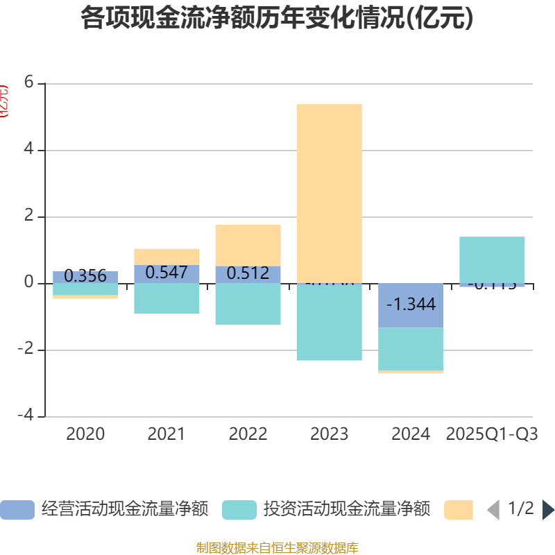 2025年前三季度,公司经营活动现金流净额为-1148.85万元,同比增加1.05亿元;筹资活动现金流净额-47.2万元,同比增加786.75万元;投资活动现金流净额1.39亿元,上年同期为1.02亿元。