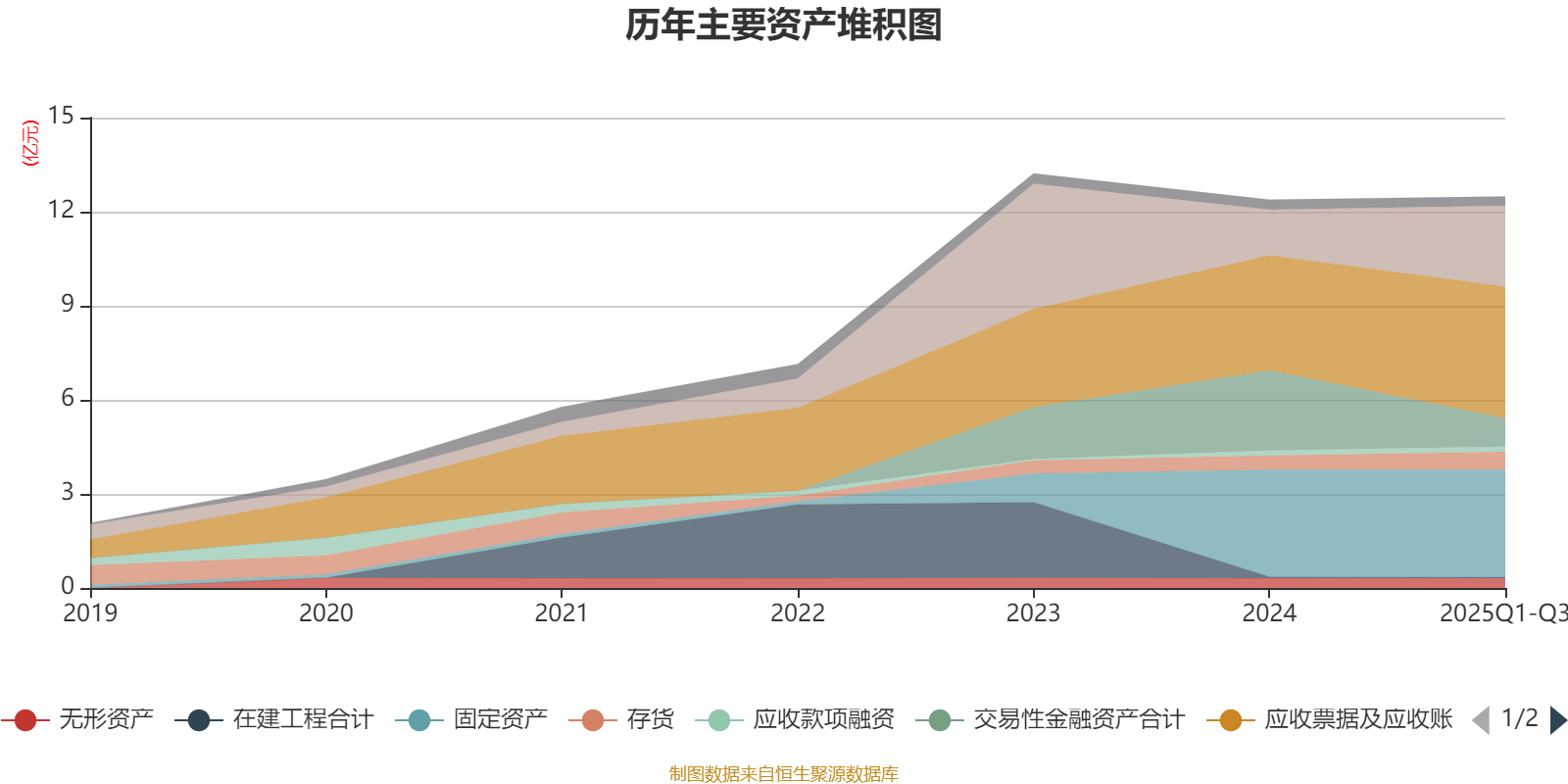 资产重大变化方面,截至2025年三季度末,公司交易性金融资产合计较上年末减少64.7%,占公司总资产比重下降13.43个百分点;货币资金较上年末增加77.28%,占公司总资产比重上升8.9个百分点;应收票据及应收账款较上年末增加14.41%,占公司总资产比重上升3.99个百分点;存货较上年末增加26.82%,占公司总资产比重上升0.94个百分点。