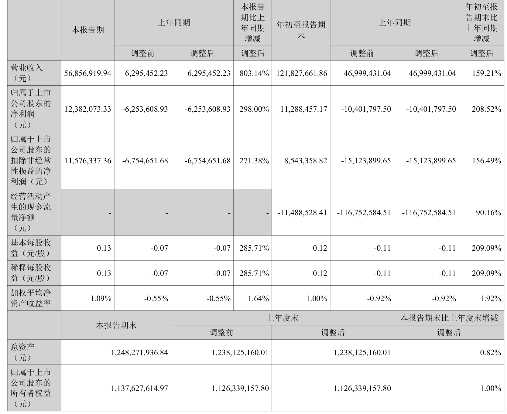 中证智能财讯北方长龙(301357)10月23日披露2025年第三季度报告。前三季度公司实现营业总收入1.22亿元,同比增长159.21%;归母净利润1128.85万元,同比扭亏;扣非净利润854.34万元,同比扭亏;经营活动产生的现金流量净额为-1148.85万元,上年同期为-1.17亿元;报告期内,北方长龙基本每股收益为0.12元,加权平均净资产收益率为1.00%。