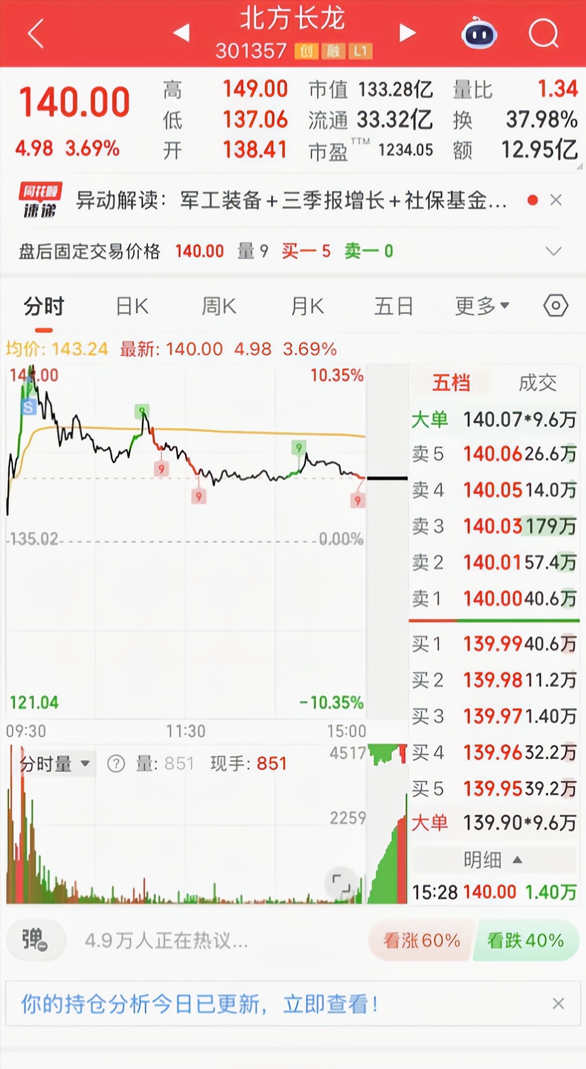 $北方长龙(SZ301357)$ 最高点148提示了一整天,让你们赶紧跑,有没有跟上的,明天大低开看承接情况再考虑进场了