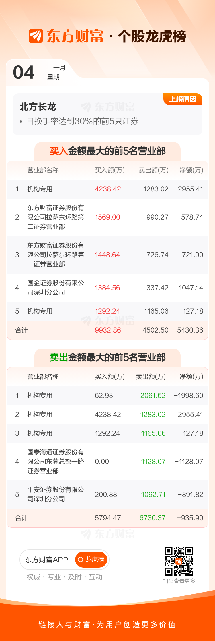 交易所2025年11月4日公布的交易公开信息显示,北方长龙因成为日换手率达到30%的前5只证券上榜。北方长龙当日收报156.86元,涨跌幅3.01%,偏离值37.57%,换手率37.57%,成交额14.13亿。