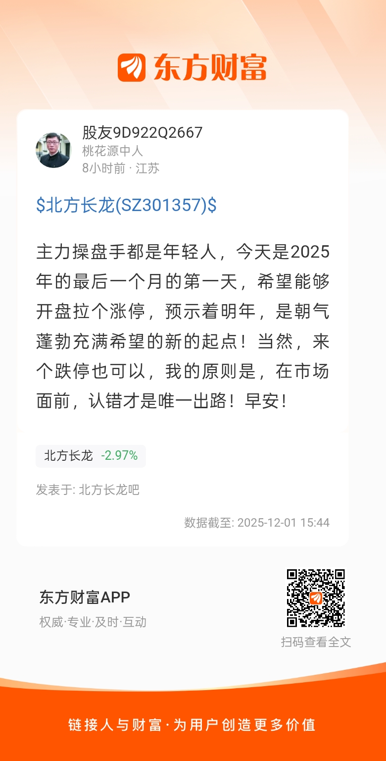 主力操盘手都是年轻人,今天是2025年的最后一个月的第一天,希望能够开盘拉个涨停,预示着明年,是朝气蓬勃充满希望的新的起点!当然,来个跌停也可以,我的原则是,在市场面前,认错才是唯一出路!早安!