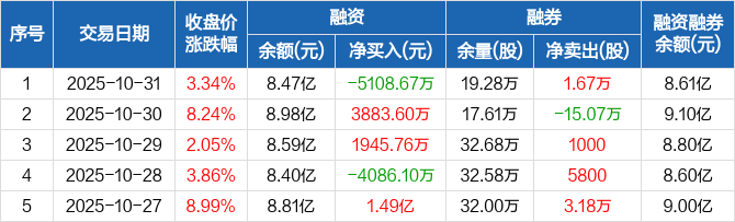 湖南裕能:融资净偿还5108.67万元,融资余额8.47亿元(10-31)