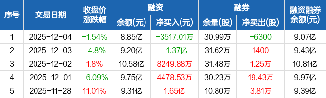 湖南裕能:融资净偿还3517.01万元,融资余额8.85亿元(12-04)