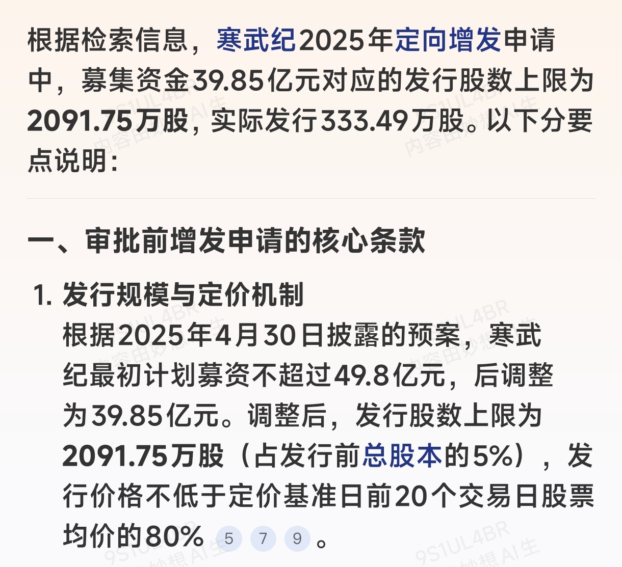 寒武纪最后增发价每股1195元,原来计划是增发价每股190.5元。最后增发价每股