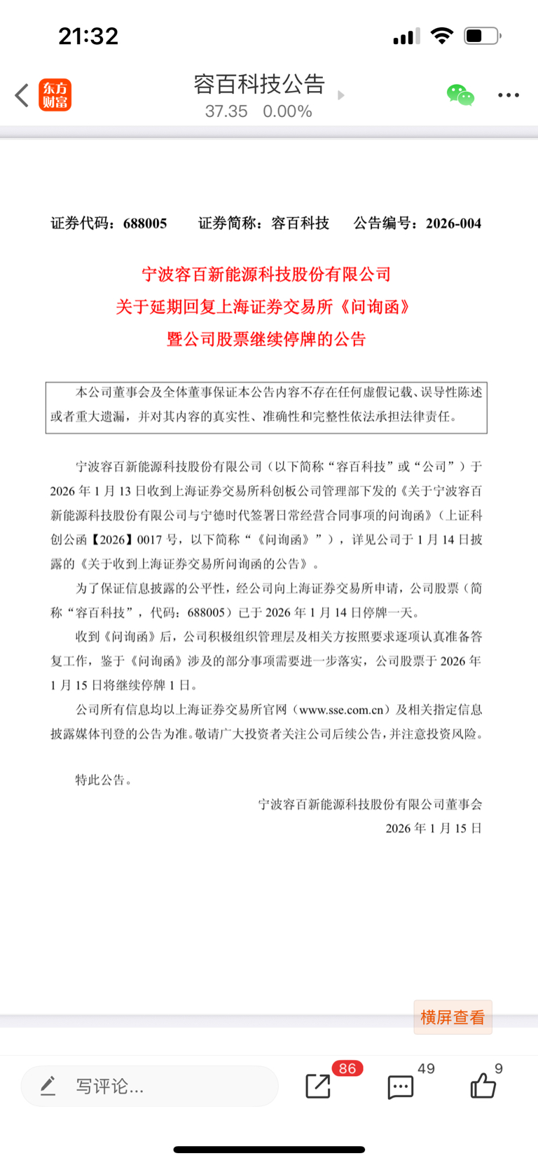 容百科技 无法在规定时间内 答复上交所问询。