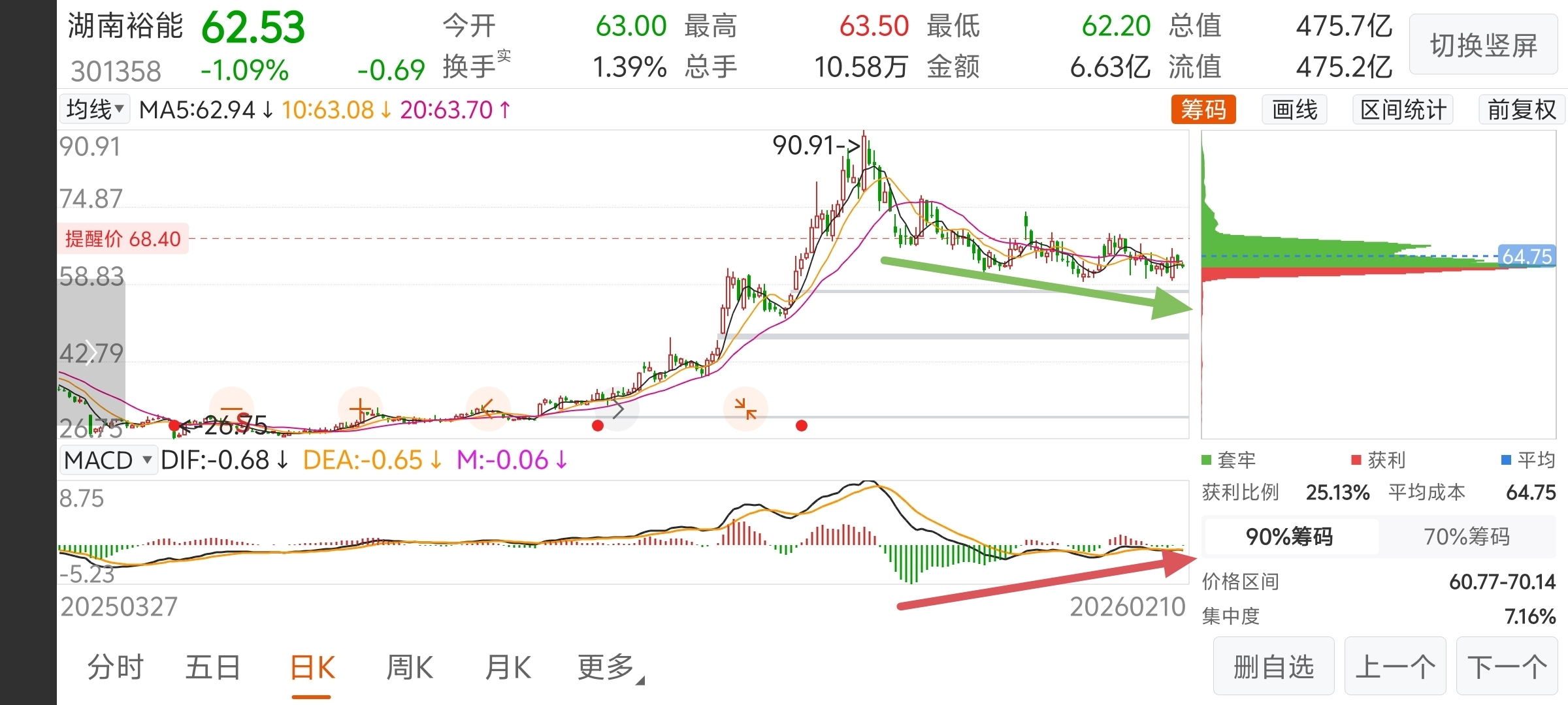 今天这个成交量已经缩到地板上了,而且还是昨天吊颈阴线成交量的一半,MACD已经在背离后没有动能了,这个地方已经有向上喷的预期了,看看明后天有没有一个放量的井喷,假如量能不够,每次冲高都是离场的机会,如果放量喷出来了,可以看前高77元附近。 //@韭菜开始冲 :受解禁事件的影响,这货今天还是砸盘了,半天的成交量可是不小,目前还是在止损位之上,而且是上一个交易日中阳线穿三线以来的第一个回踩,可以继续持股等待,如果明天强势跌破60.7元就止损离场,说明下跌趋势还没有走完。理论止盈线设在71元(前期未补满的缺口位),理想止盈线在77元。继续等……