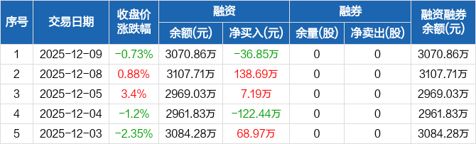 东南电子:融资净偿还36.85万元,融资余额3070.86万元(12-09)