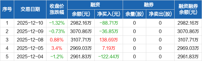 东南电子:融资净偿还88.71万元,融资余额2982.16万元(12-10)