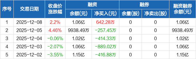 荣旗科技:融资净买入642.28万元,融资余额1.06亿元(12-08)