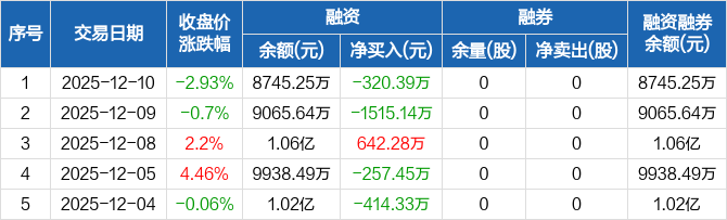荣旗科技:融资净偿还320.39万元,融资余额8745.25万元(12-10)