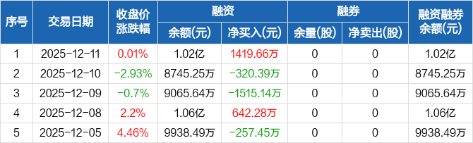 荣旗科技:融资净买入1419.66万元,融资余额1.02亿元(12-11)