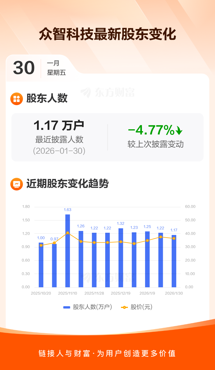 众智科技:截至1月30日最新股东户数1.17万户,较上期减少4.77%