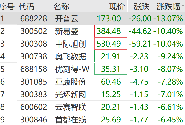 个股方面,开普云跌超13%,新易盛、中际旭创、澜起科技、普冉股份等多股大跌。