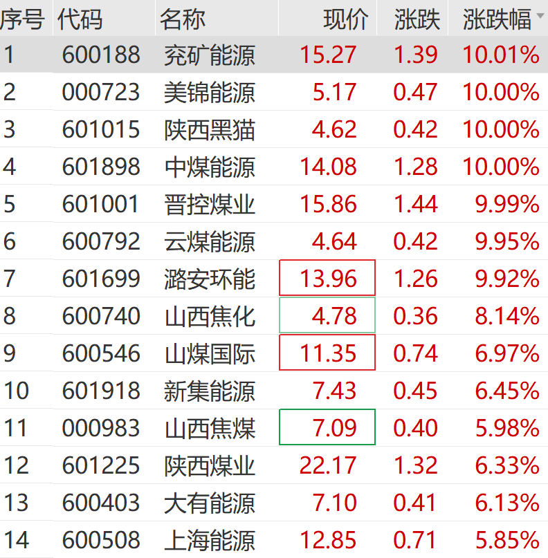 2月4日上午,煤炭板块盘中直线拉升,成份股全部飘红;兖矿能源、陕西黑猫、云煤能源、中煤能源、美锦能源等纷纷涨停,山煤国际、陕西煤业等跟涨。