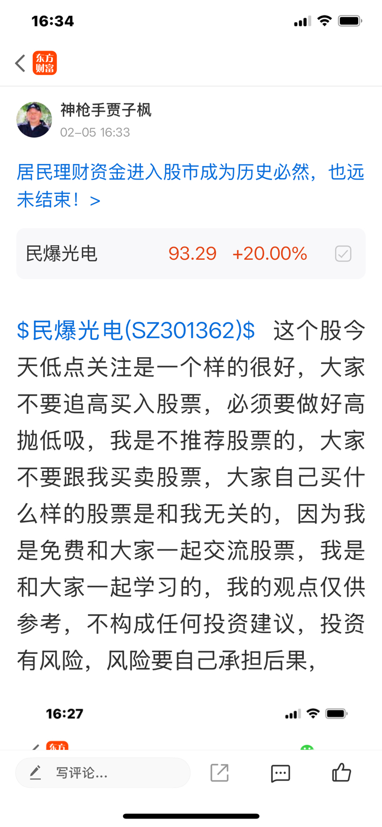 $民爆光电(SZ301362)$ 这个是很好的强势股,大家不要追高买入,必须要做好高抛低吸,我是不推荐股票的,大家不要跟我买卖股票,大家自己买什么样的股票是和我无关的,投资有风险,风险要自己承担后果,