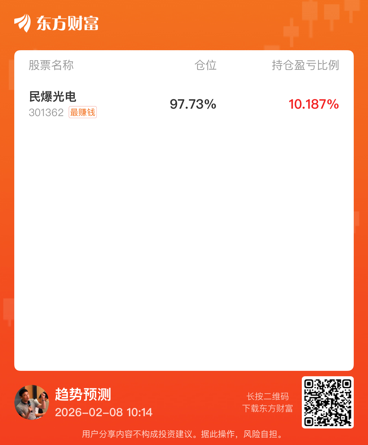 $民爆光电(SZ301362)$ 抛开观点看本质,我们炒股炒什么呢?不就是炒预期,现在有预期了,大家知道如何了吧?韭菜和老手各有所悟!情绪和环境共振!大家能想到什么?自己辩论去吧!资金博弈的过程是什么?散户的买卖又是为什么?自己悟出,就是收获之时!希望能帮到各位伙伴。#周度策略# #复盘记录# #收盘点评#