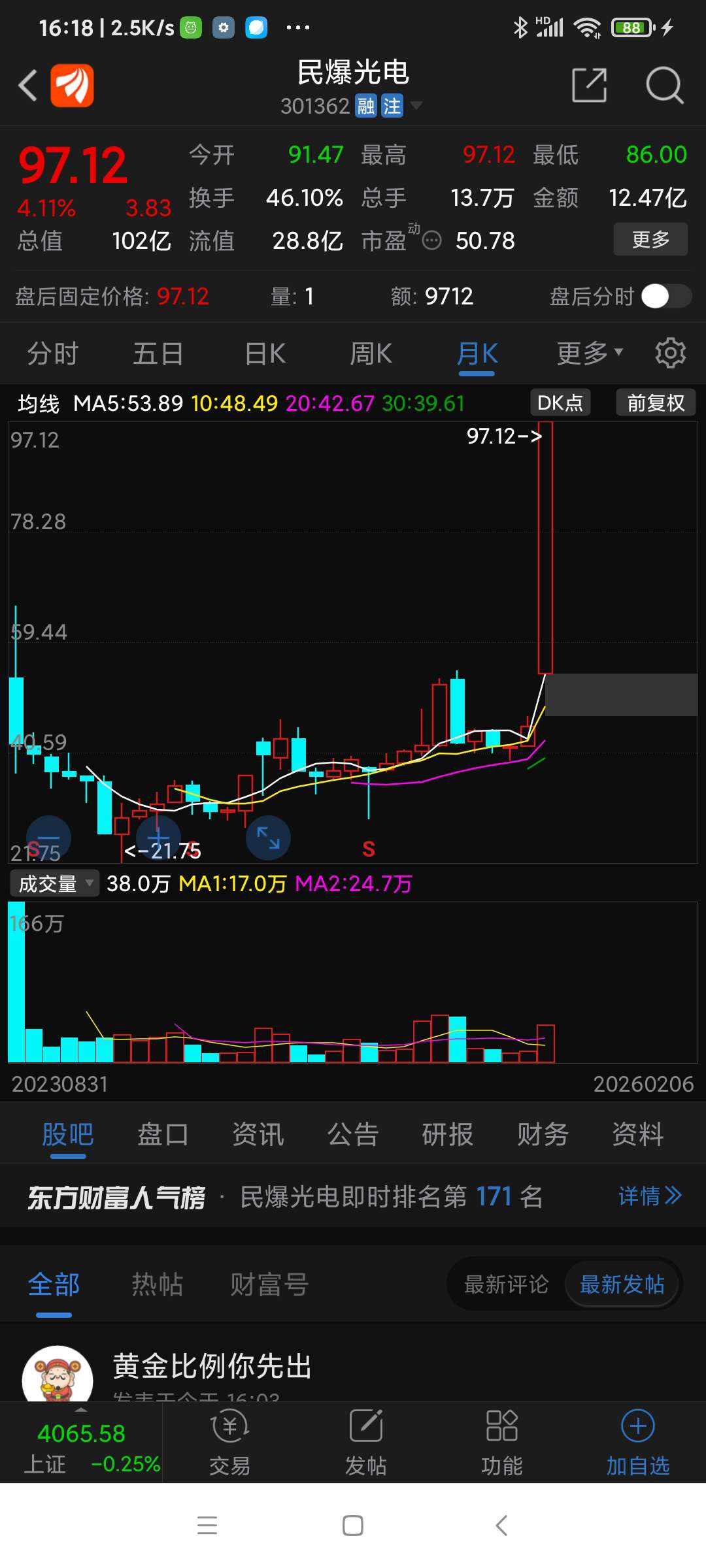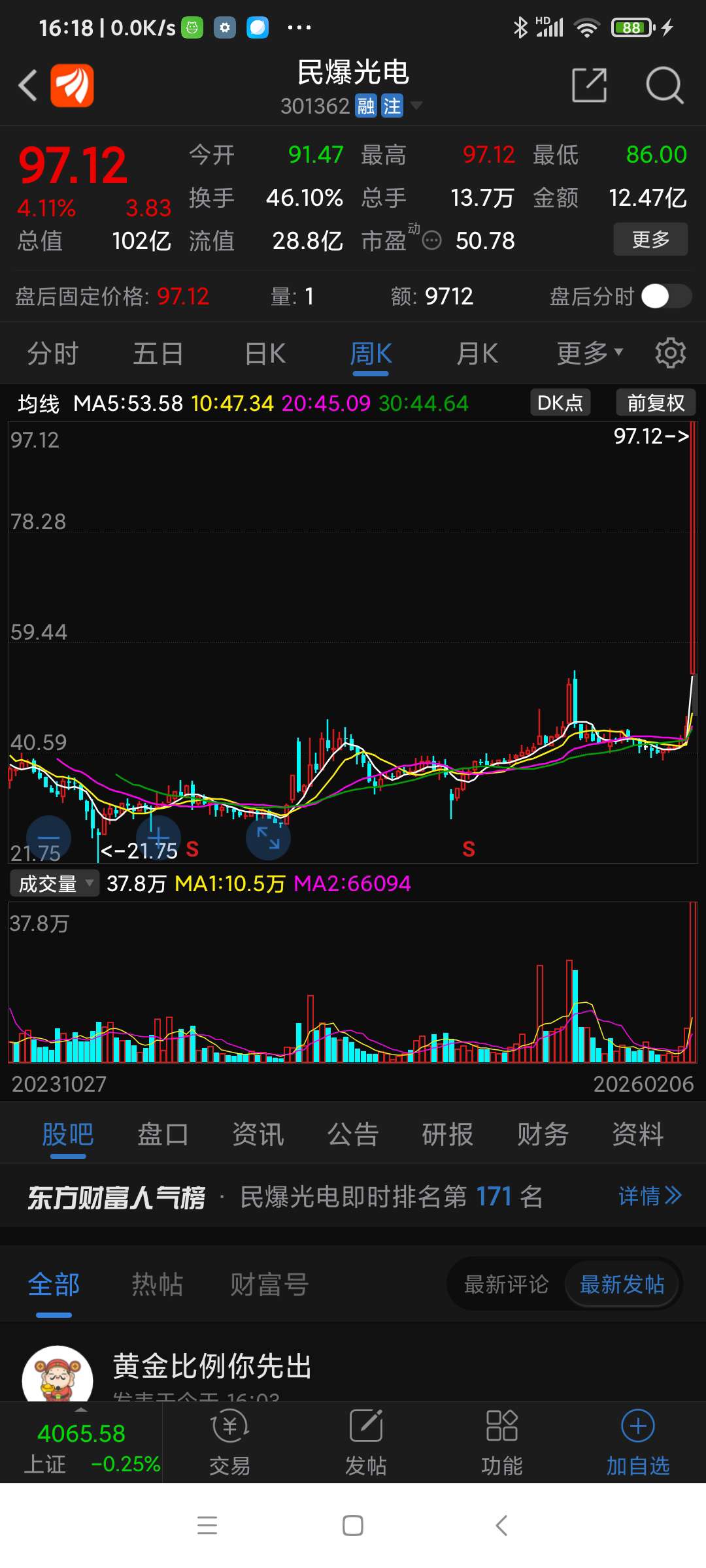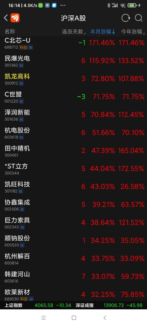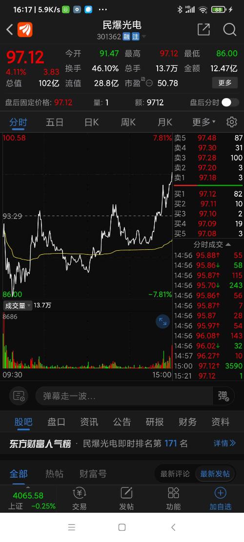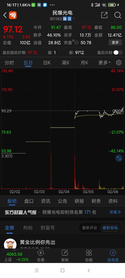 民爆光电,本周涨幅列沪深股市第一名,