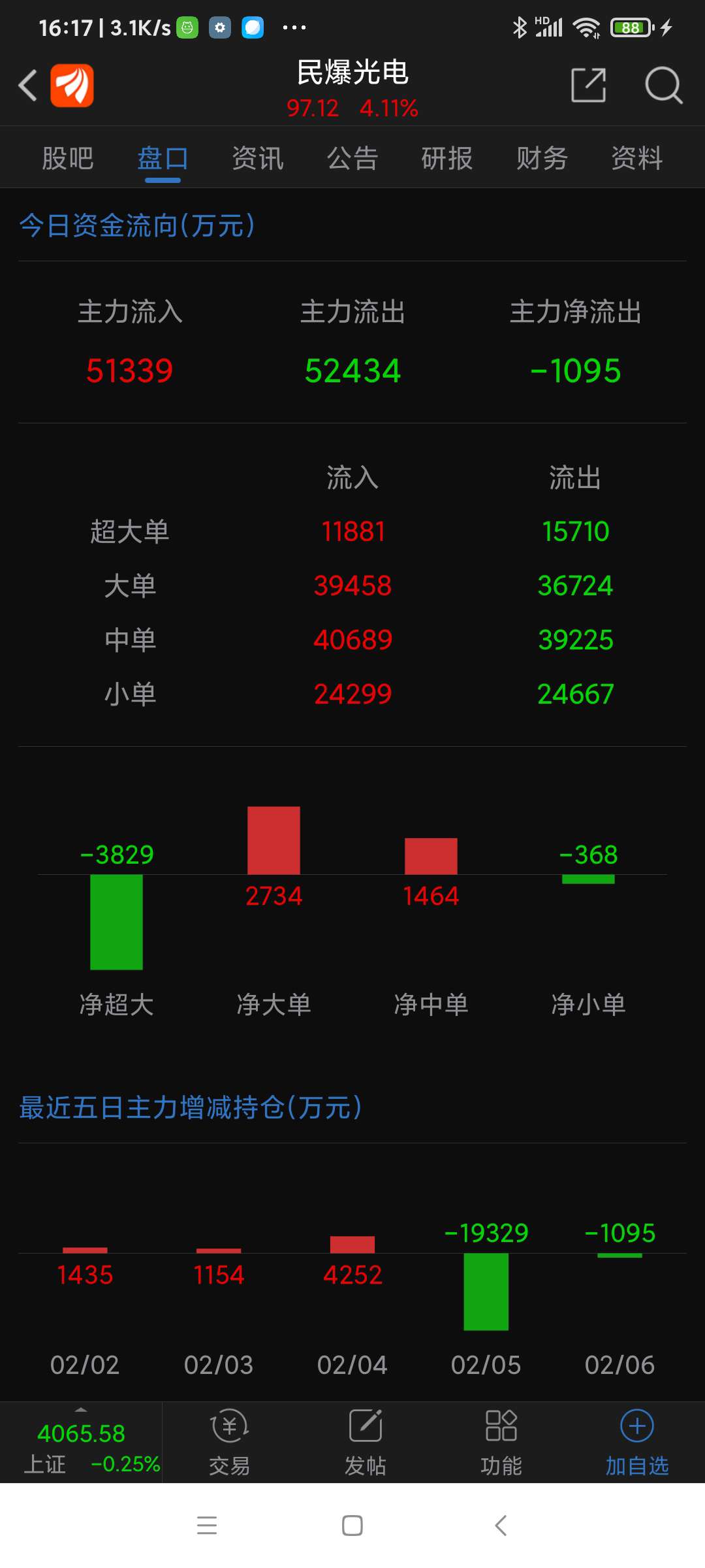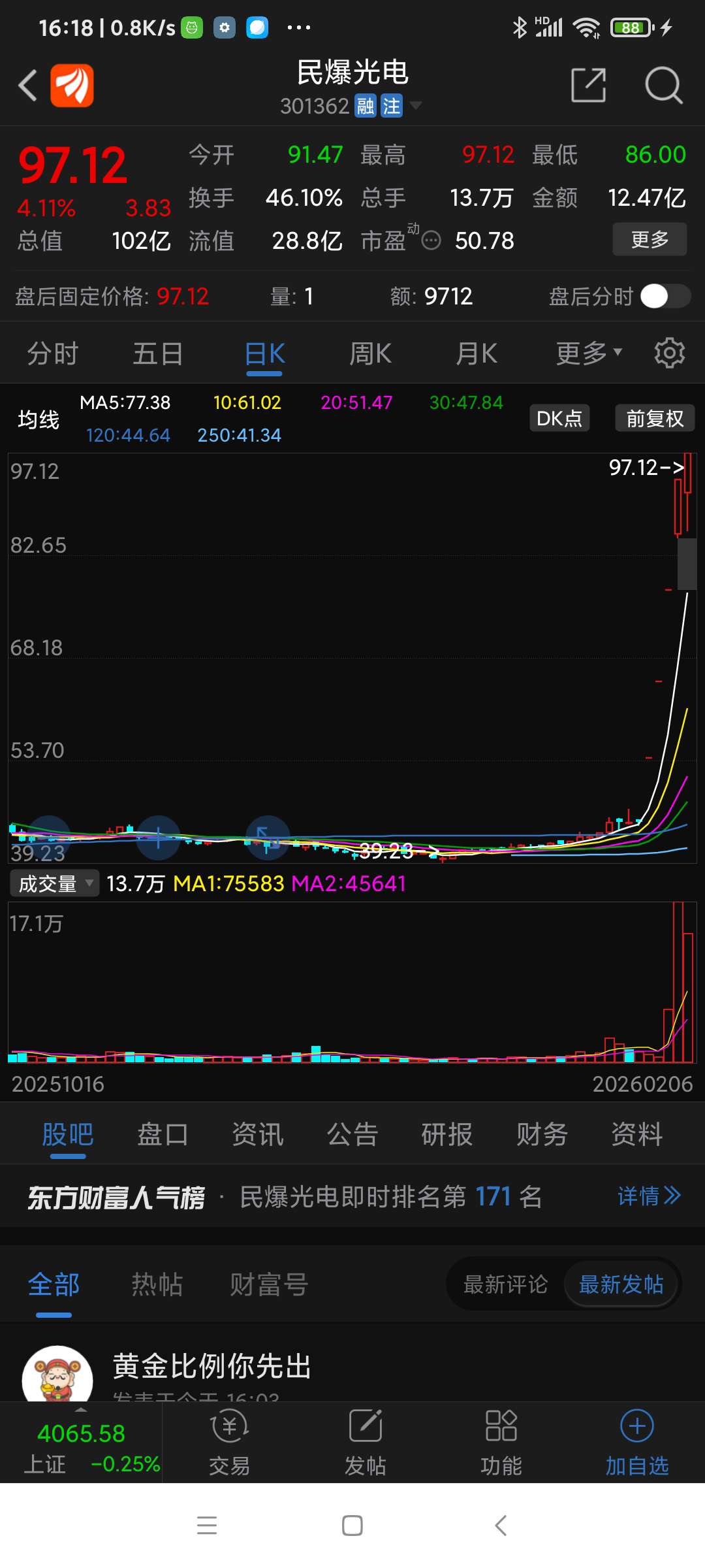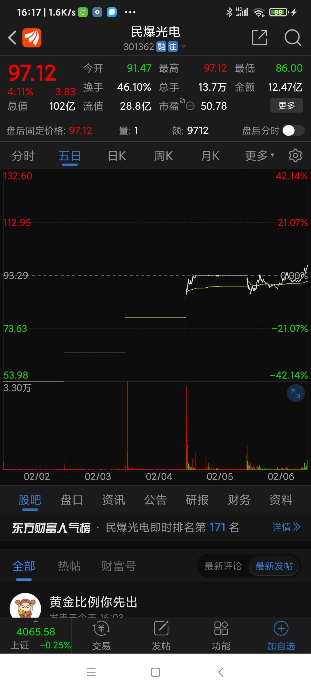 民爆光电,本周涨幅列沪深股市第一名,