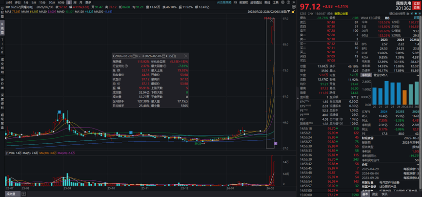 整体来看,过去一周,民爆光电股价累计涨近116%,其中2月6日股价报收于97.12元/股,创历史新高。